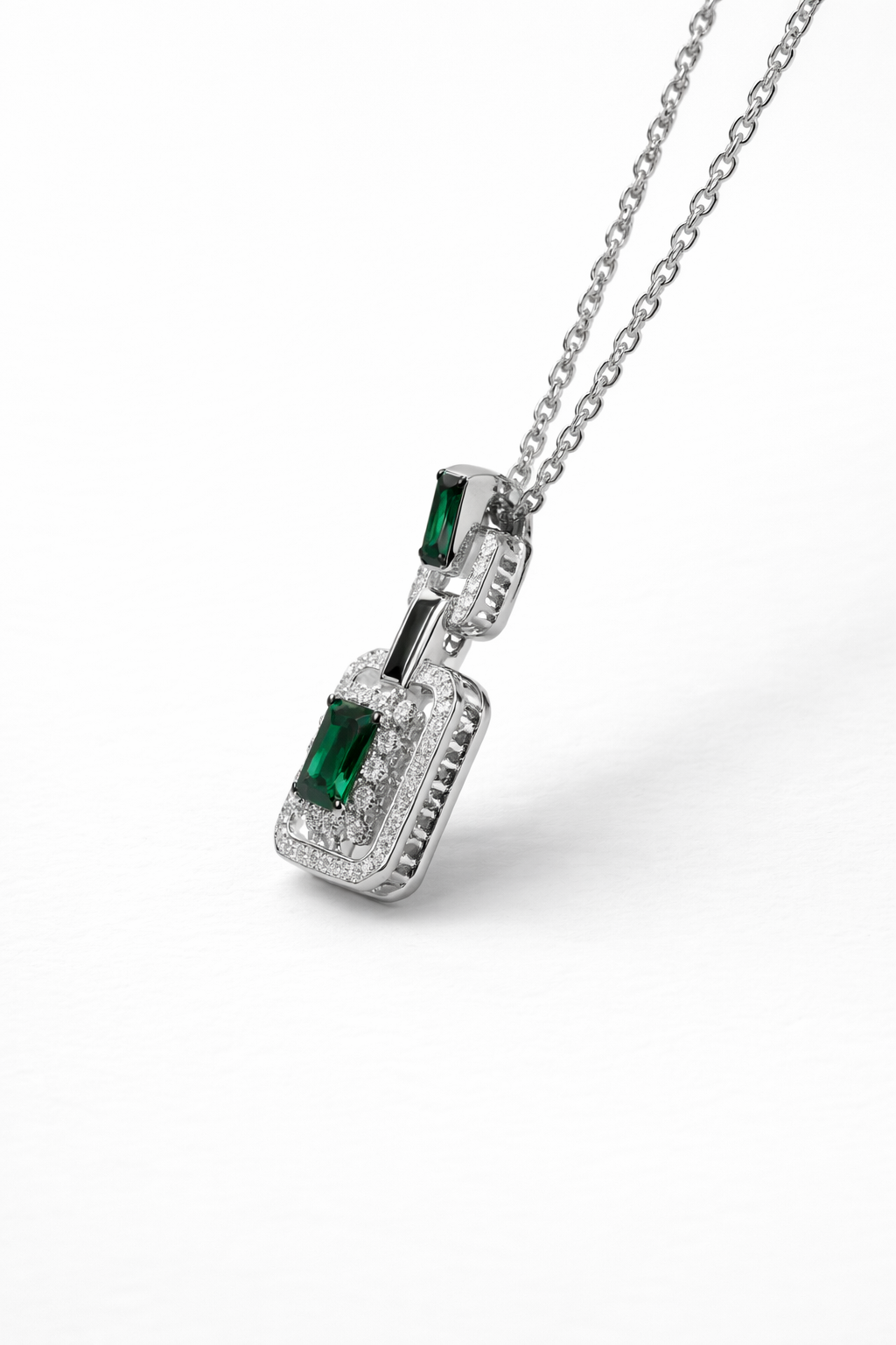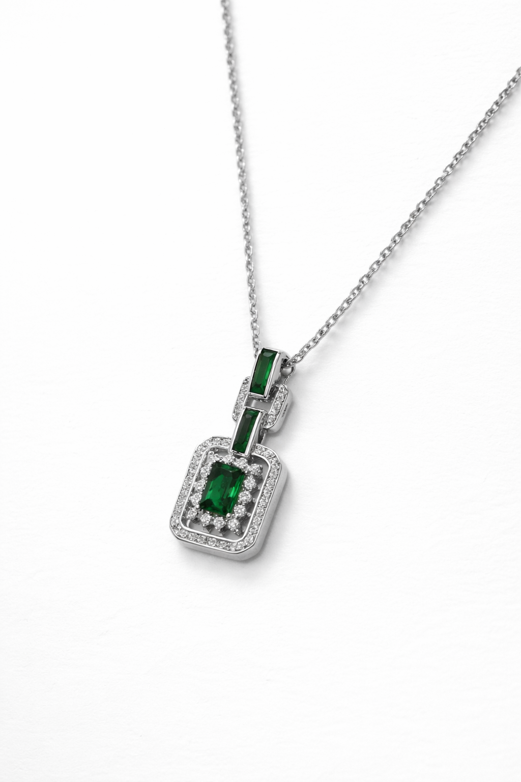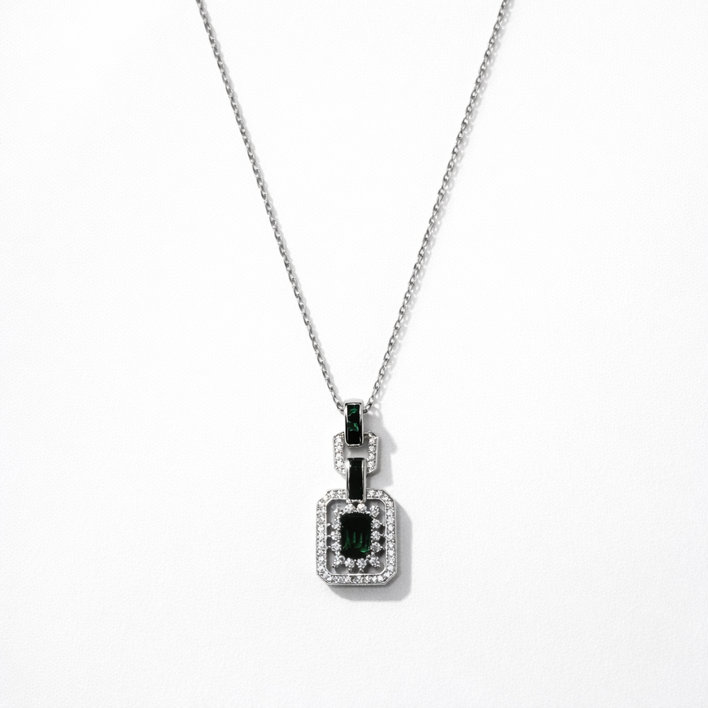 Modern elegance meets bold charm in this 925 sterling silver pendant necklace. Featuring a deep emerald-green rectangular stone framed with sparkling cubic zirconia, the design is elevated with a sleek link-style connector detail on top.