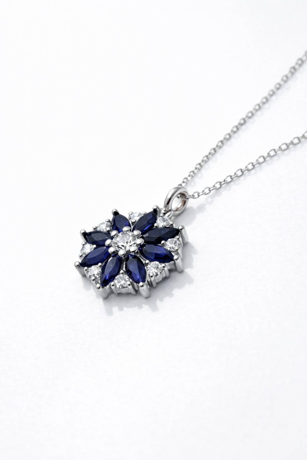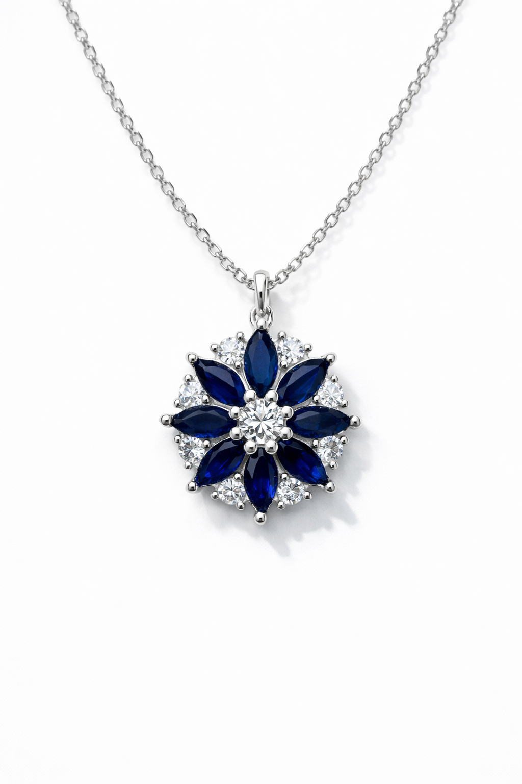 Graceful and eye-catching, this 925 sterling silver necklace features a stunning floral pendant adorned with deep royal blue stones and sparkling zircon accents. The layered petal design creates a rich, dimensional look that adds elegance and sophistication to any outfit.