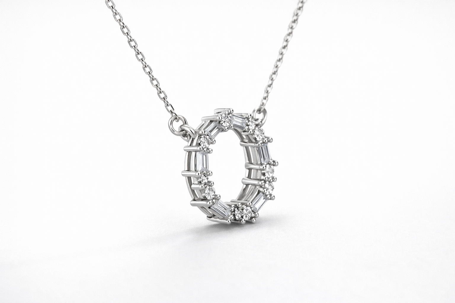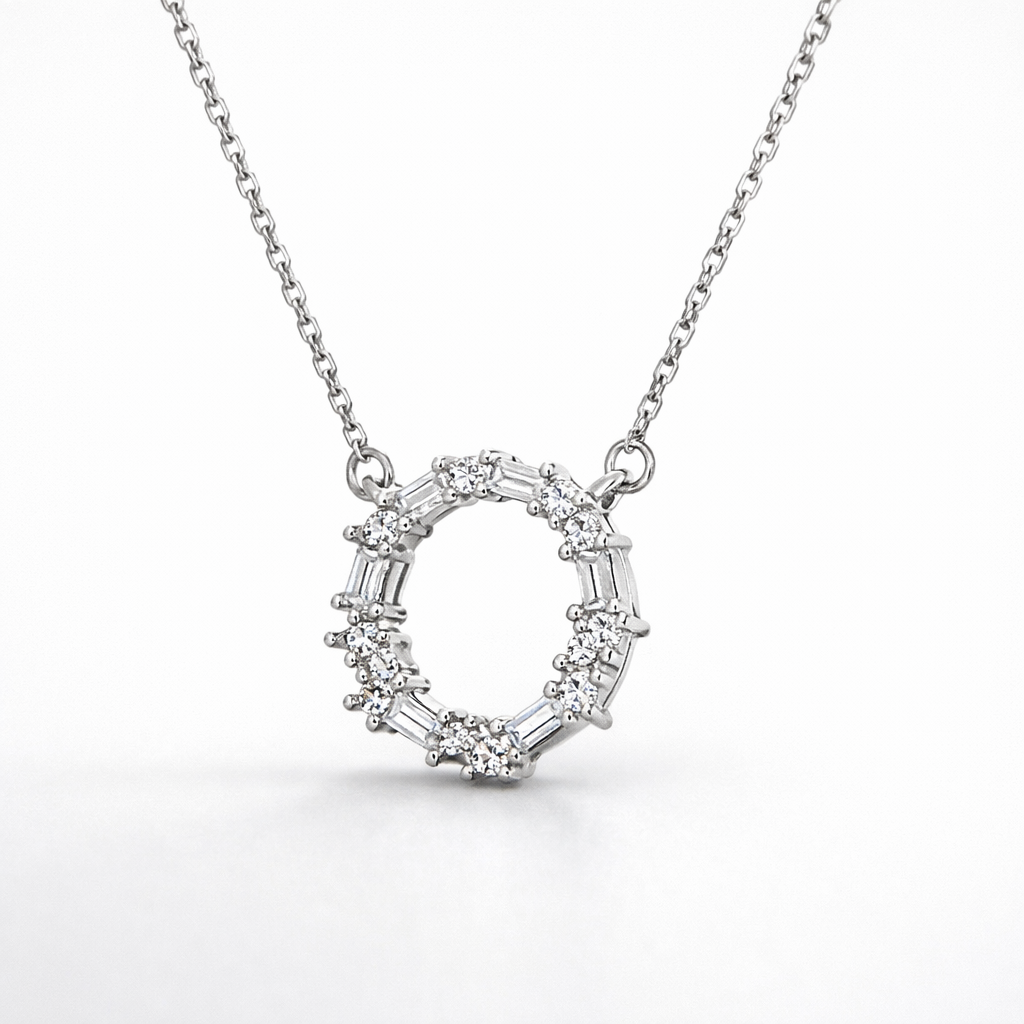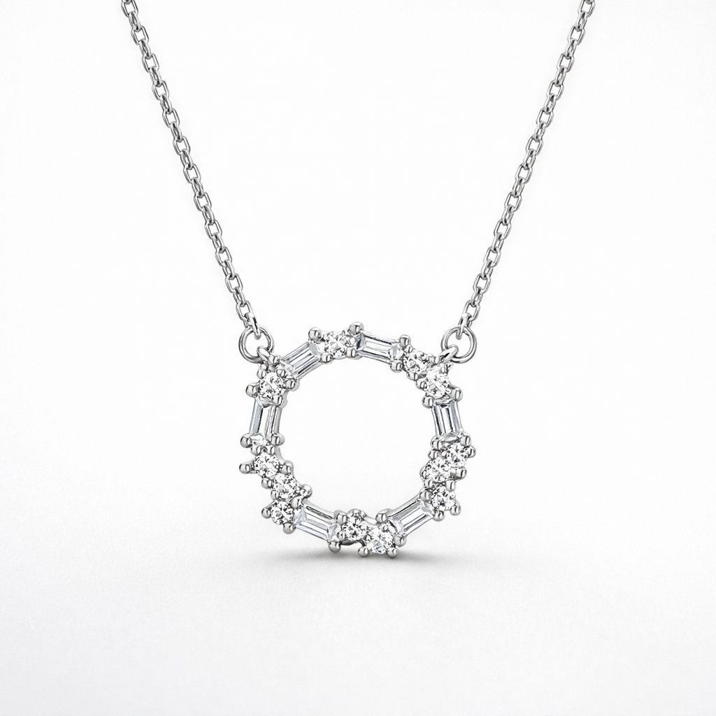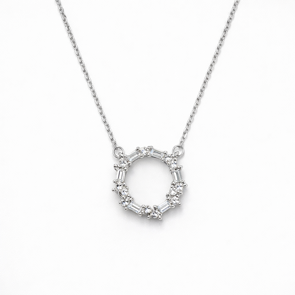 Elegant and timeless, this 925 sterling silver necklace features a delicate circular halo pendant adorned with shimmering cubic zirconia stones. The open-circle design symbolizes eternity and completeness, while the subtle sparkle adds refined sophistication.