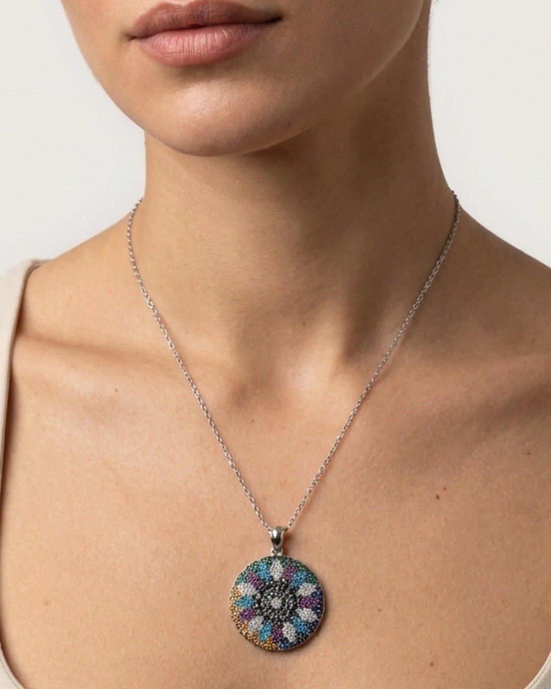 Multicolor Floral Medallion Pendant Necklace Set – 925 Sterling Silver