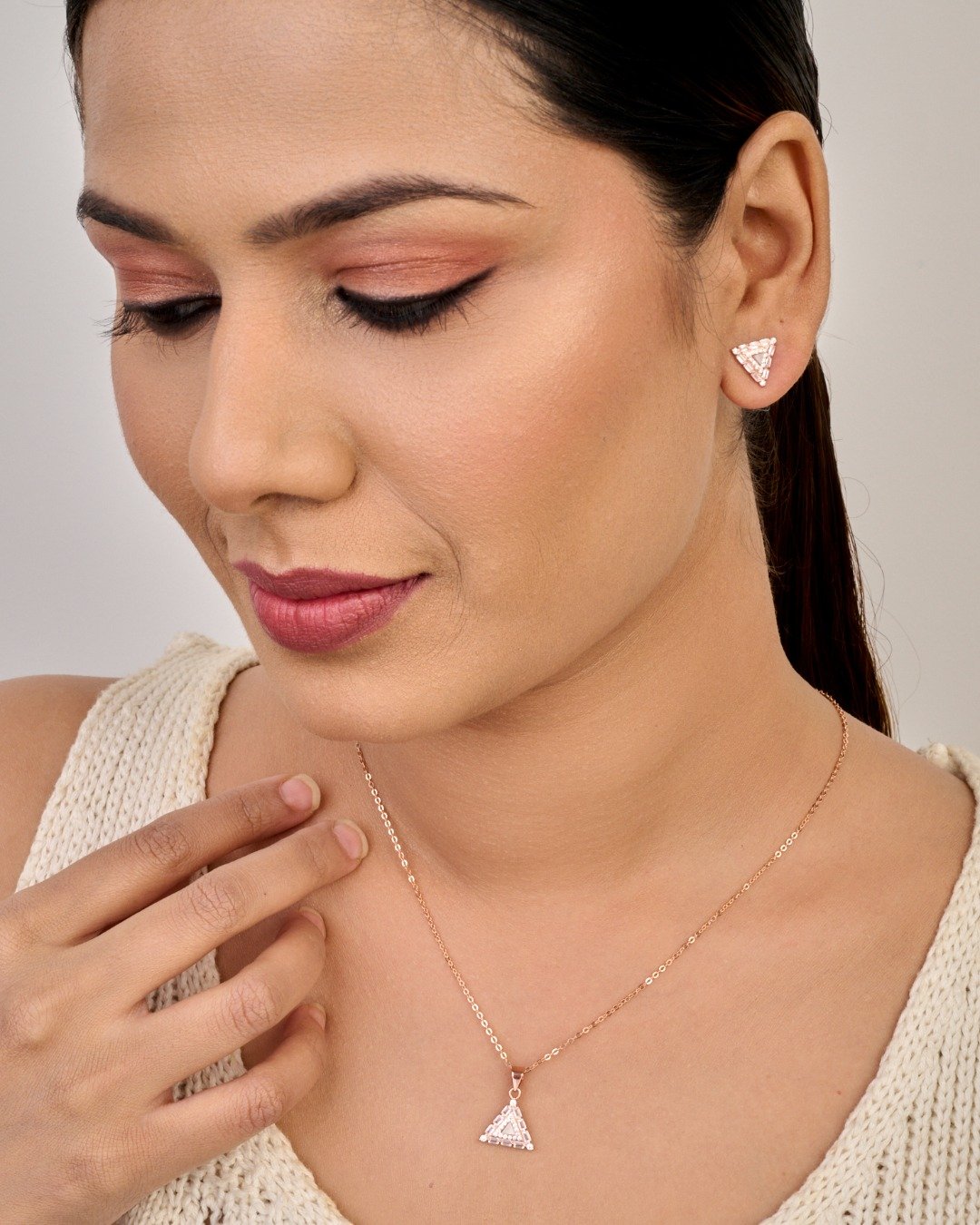 Rose Gold Triangle Halo Pendant Set – 925 Sterling Silver