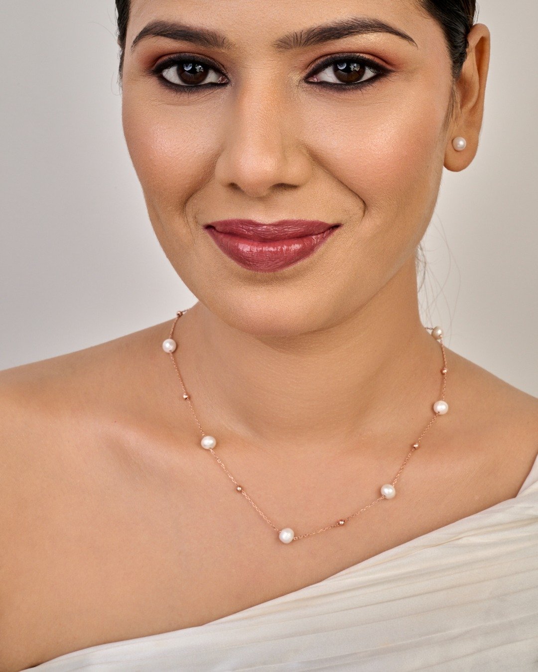 Classic Pearl Station Rose Gold Necklace – 925 Sterling Silver