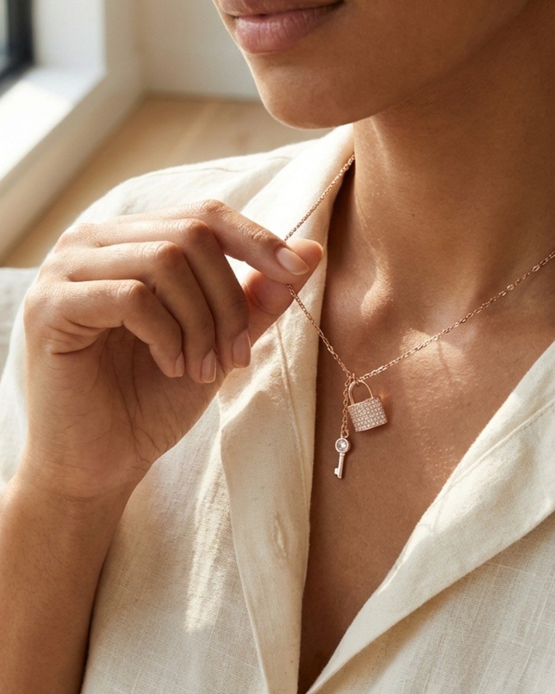 Rose Gold Lock & Key Charm Pendant Necklace – 925 Sterling Silver