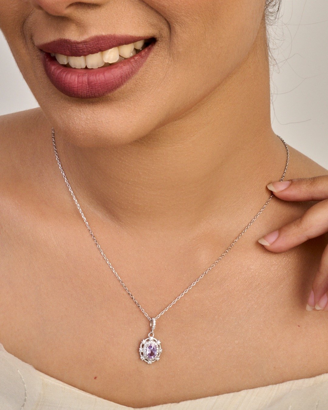 Vintage Oval Lavender Halo Pendant Necklace – 925 Sterling Silver