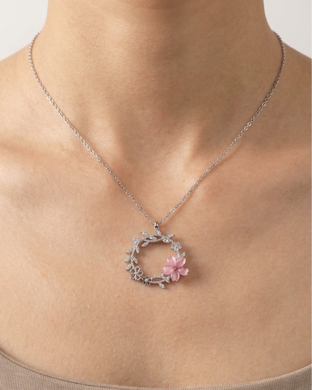 Pink Blossom Floral Wreath Pendant Necklace – 925 Sterling Silver