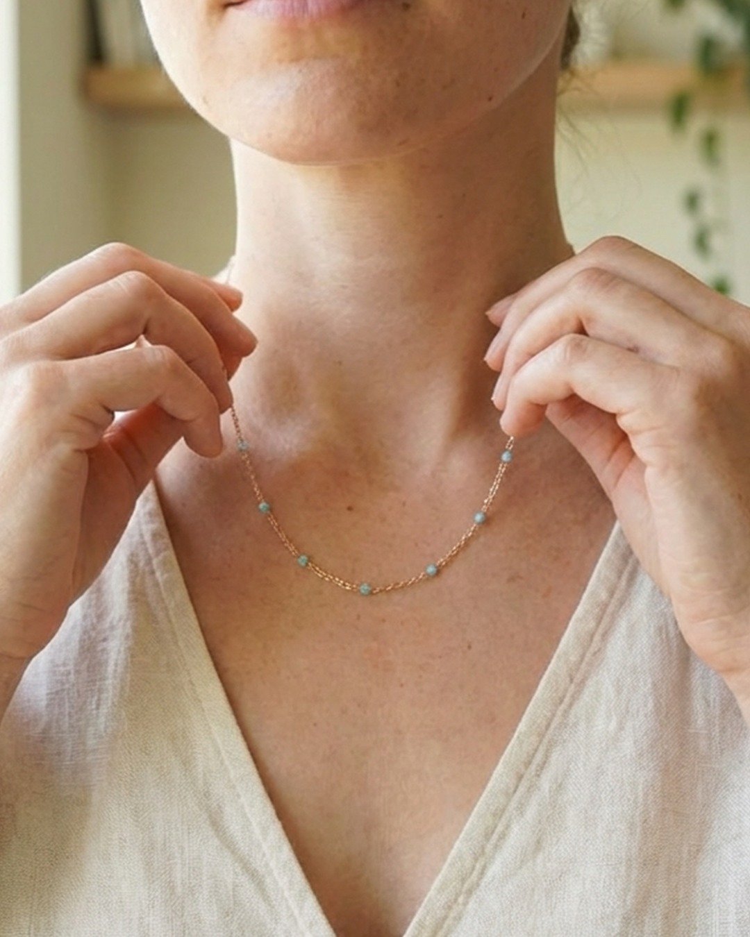 Aqua Beaded Minimal Chain Necklace – 925 Sterling Silver